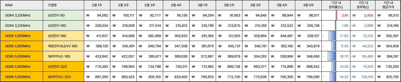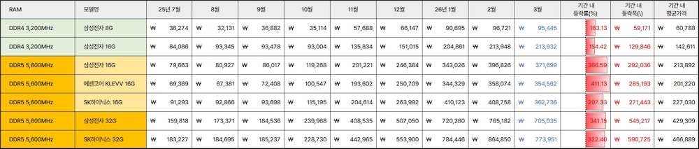 주요 제품별 가격 동향은 DDR4 3,200MHz 삼성전자 8GB(+163.13%), 16GB(+154.42%), DDR5 5,600MHz 삼성전자 16GB(+366.59%), 32GB(+341.15%), SK하이닉스 16GB(+297.33%), 32GB(+322.4%), 였습니다.