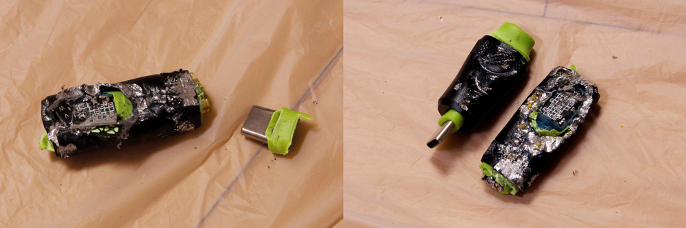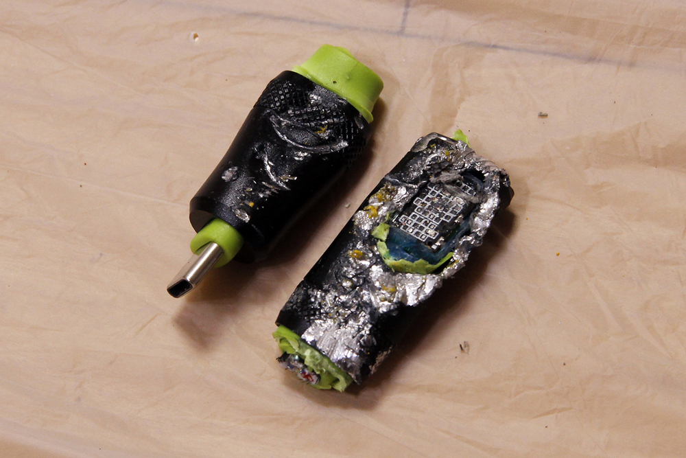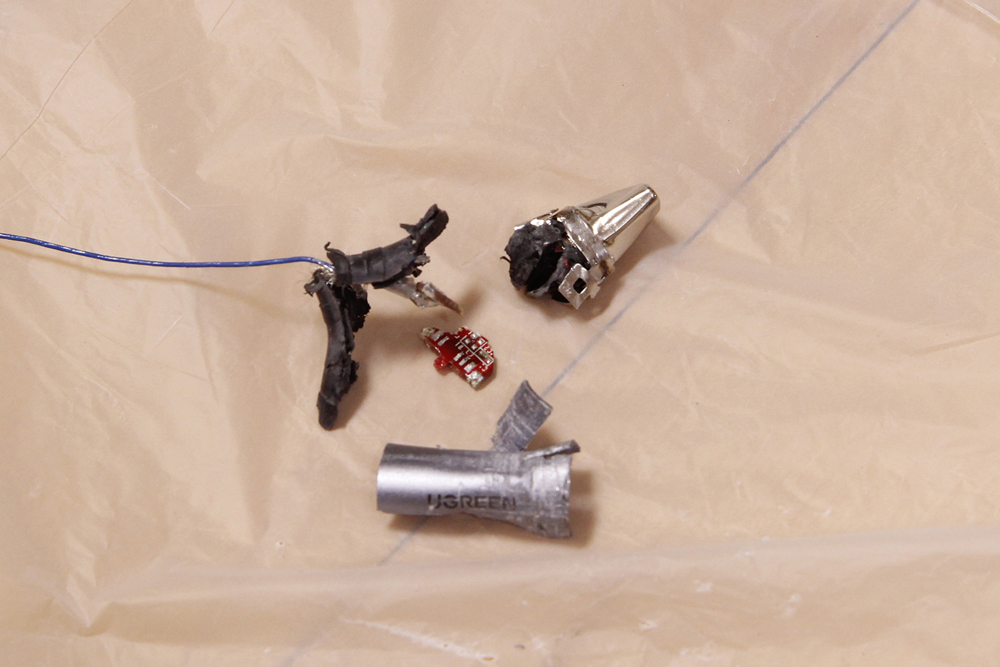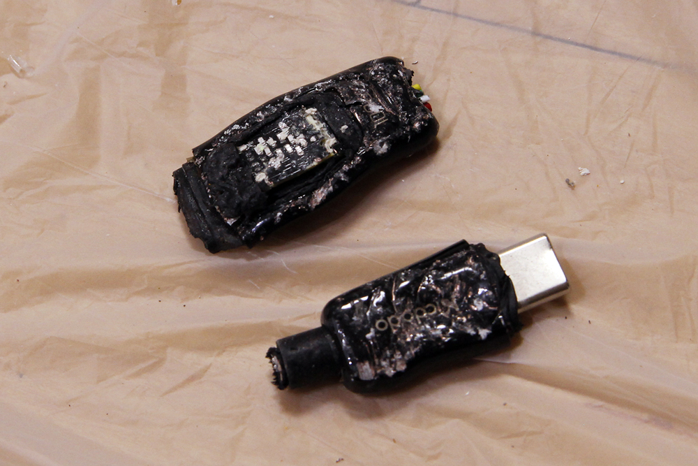 패브릭 재질이 녹아 케이블 변형이 일어났으며, 케이블에 불이 붙었지만 금세 꺼졌습니다.