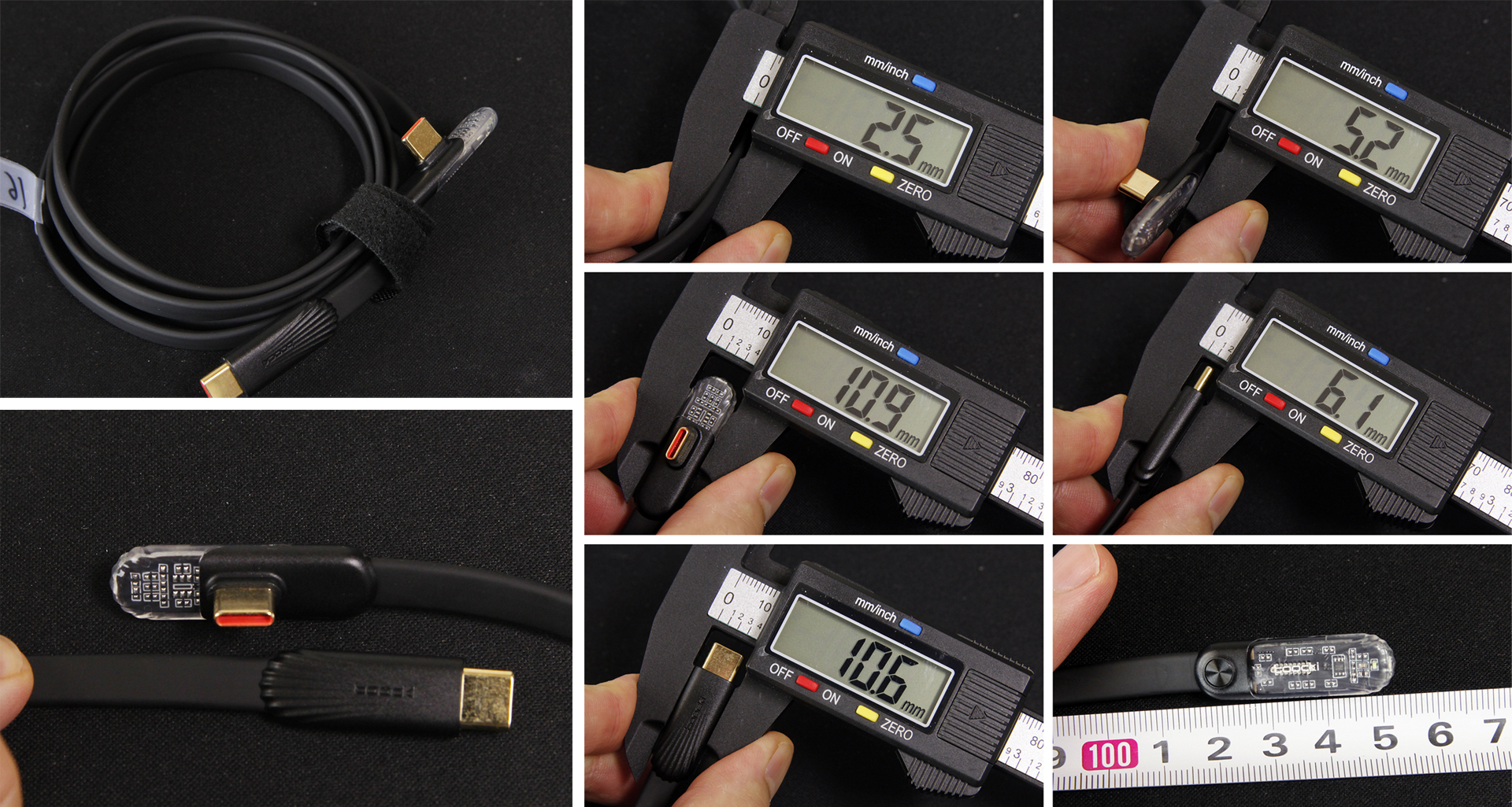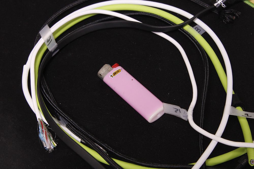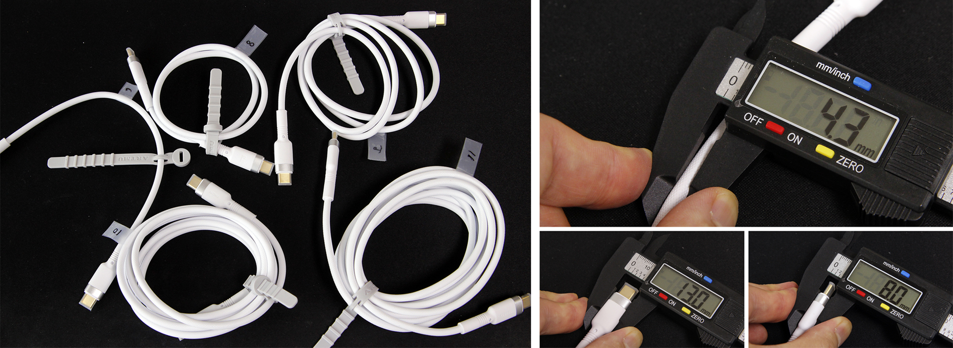내구성 테스트로 기존 벤치마크에 사용된 18종의 케이블 중 재질과 형태에 따라 분류한 6종을 선택해 케이블을 일정한 힘으로 잡아당기는 장력 테스트, 직접 분해해 내부 구조를 파악하는 분해 테스트, 케이블 마감 재질에 직접 불을 붙이는 가연성 테스트를 진행했습니다.