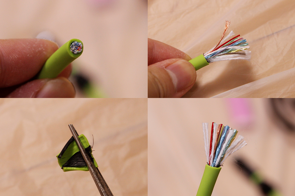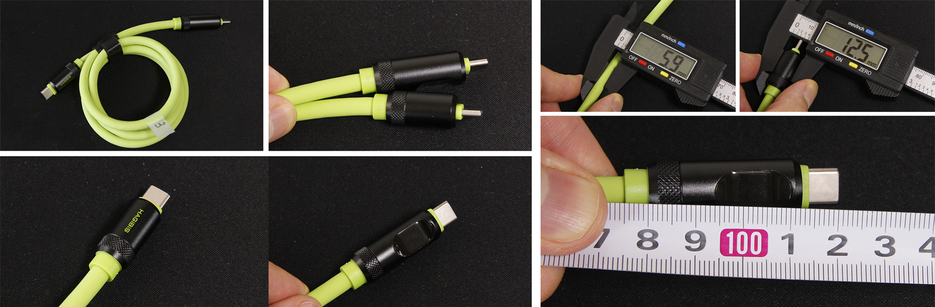 외관은 연두색 실리콘으로 마감되어 있으며, 테스트한 케이블 중에서 가장 두꺼운 편에 속합니다. 케이블 내부에는 화재와 단선을 방지하기 위한 나일론 소재의 실드가 있으며, 단면을 살펴보면 데이터 전송 및 충전을 위한 케이블이 12가닥, 장력과 케이블 보호를 위한 흰색 나일론 케이블이 8가닥 보이고 장력과 단선 방지를 위한 구리색과 은색 케이블이 각각 1가닥씩 포함되어 있습니다.