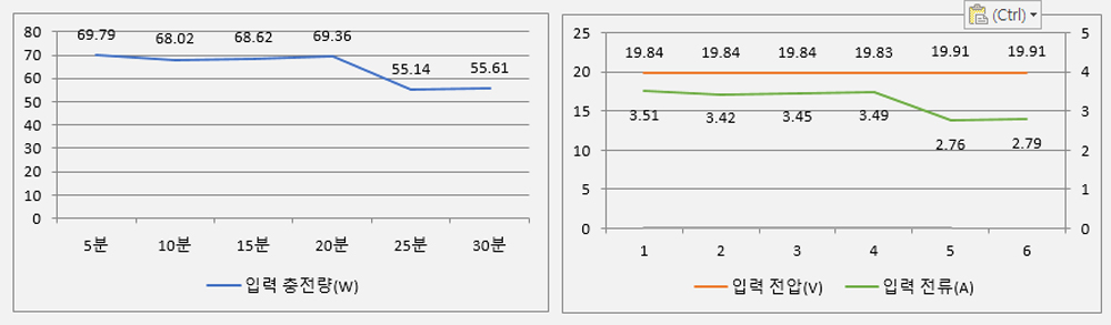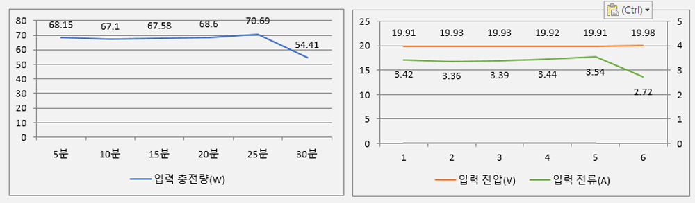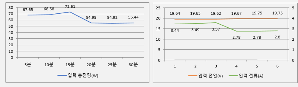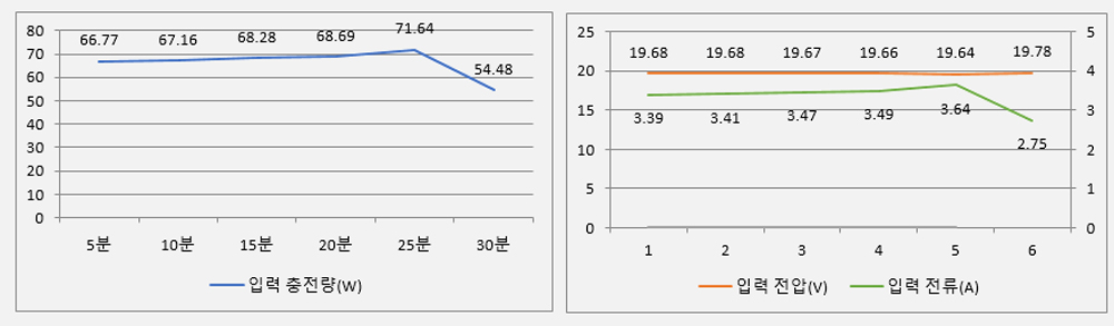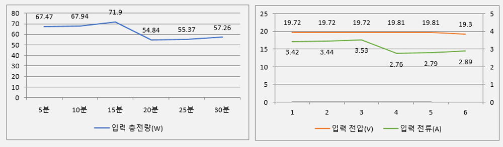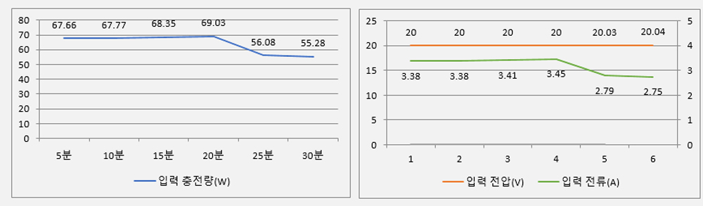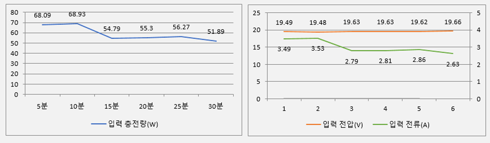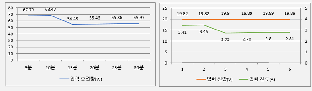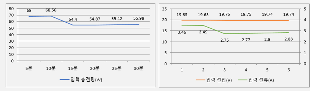 - 초기 68W의 충전량이 10분까지 68.56W로 유지.
