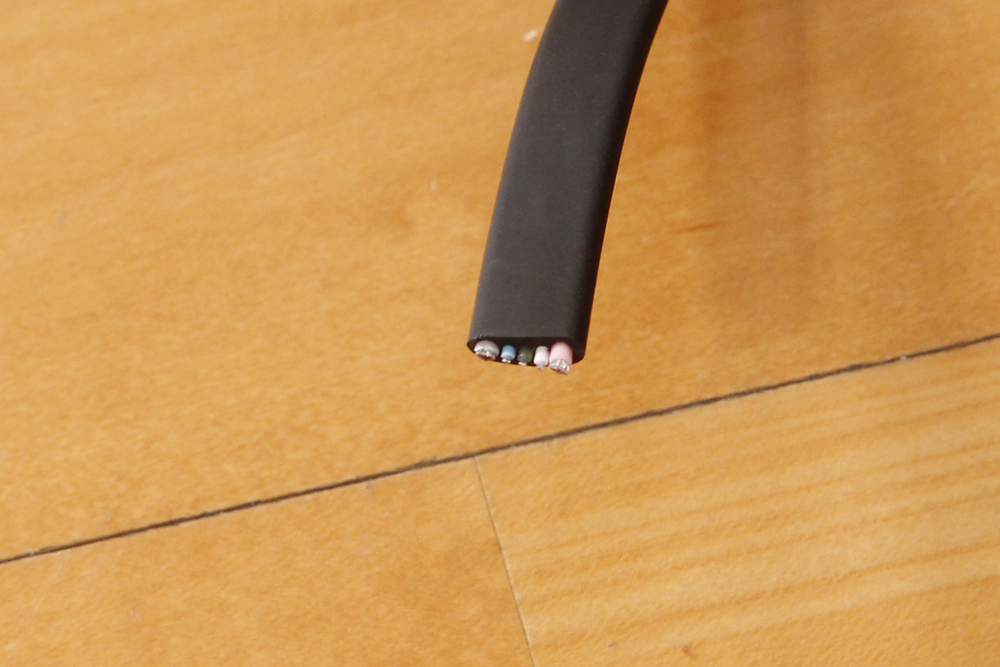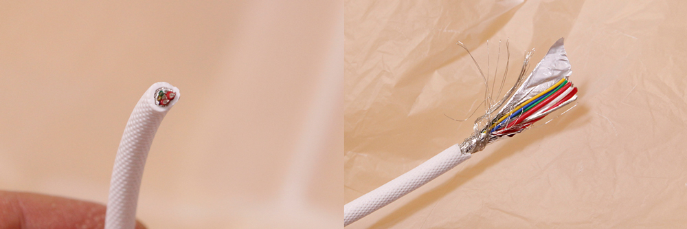 외부가 패브릭 소재로 1차 마감되고, TPE 소재로 2차 마감되어 내부 케이블을 보호하고 있습니다. 단면을 살펴보면, 데이터 전송 및 충전을 위한 6가닥의 케이블이 보이며, 실드나 장력을 위한 추가적인 케이블은 확인되지 않았으며 내부 구성은 비교적 단순하게 이루어져 있습니다.