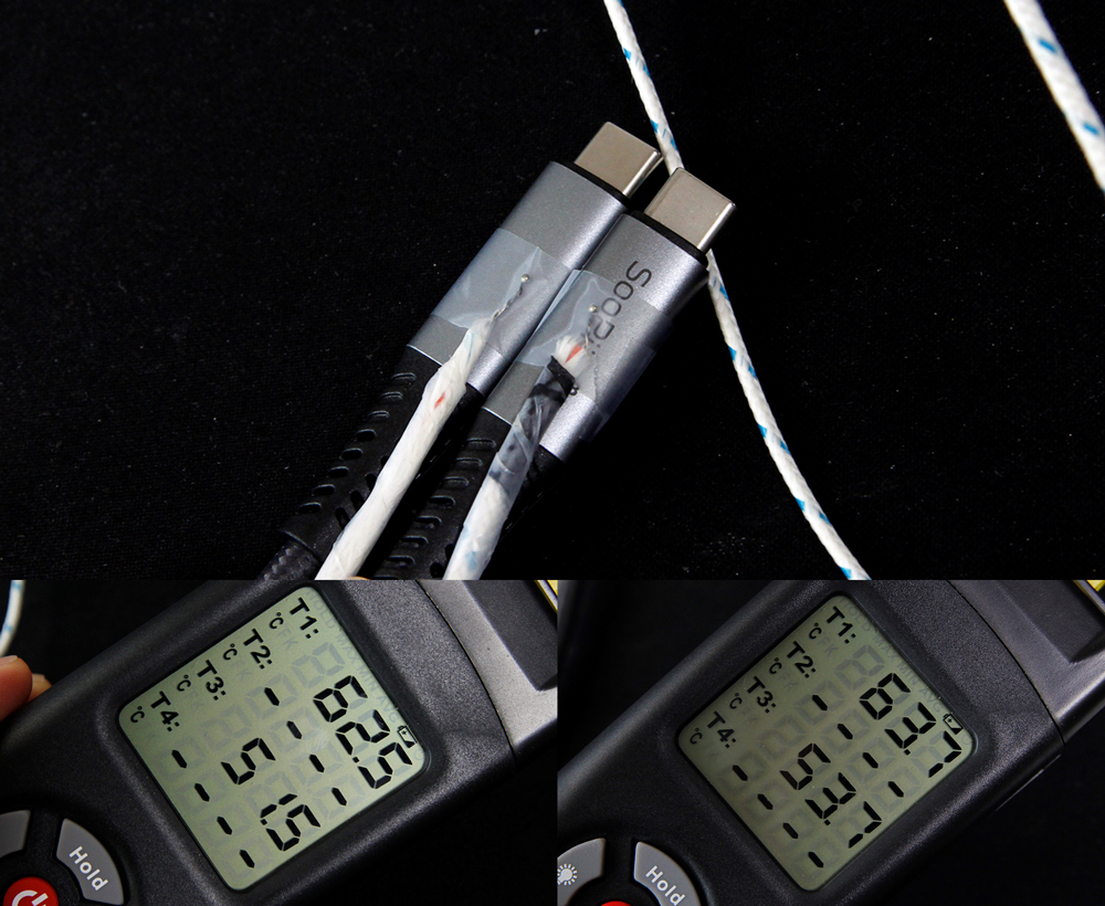 반면, toocki PD 100W 엘보우 Type C to C 케이블은 내부 장력 유지를 위한 보강선이나 보호를 위한 실드 처리가 전혀 되어 있지 않아, 외부 충격으로부터 케이블을 보호할 수 있는 장치가 부족했다. 이로 인해, 내구성 면에서 낮은 평가를 받았습니다.