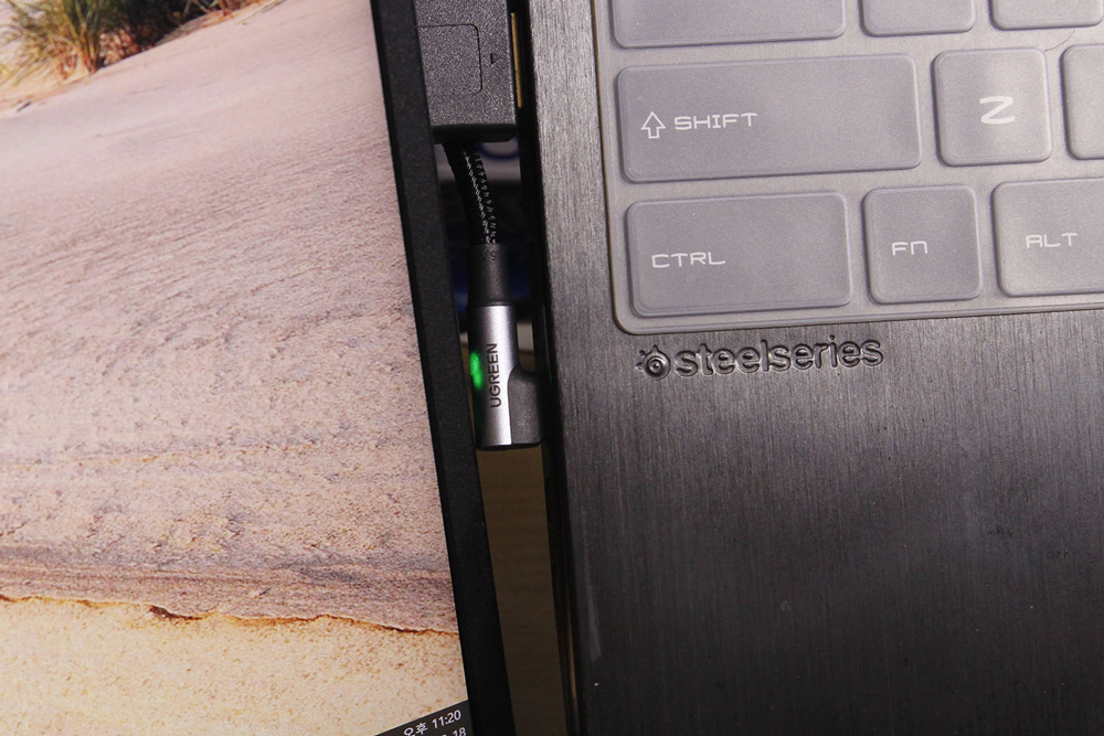 UGREEN Type C to C 양쪽 꺾임 케이블의 외부는 패브릭 소재로 1차 마감되어 있으며, TPE 소재의 케이블로 2차 마감 처리되어 내부 케이블을 보호하고 있습니다. 그 다음은 매시 와이어와 알루미늄 실드로 추가 보호되어 있으며 케이블 내부에는 전력 공급 및 데이터 전송을 위한 6가닥의 케이블과 장력 및 안전을 위한 그라운드 와이어 1가닥, 그리고 나일론 소재의 여러 가닥의 케이블이 포함되어 있습니다.