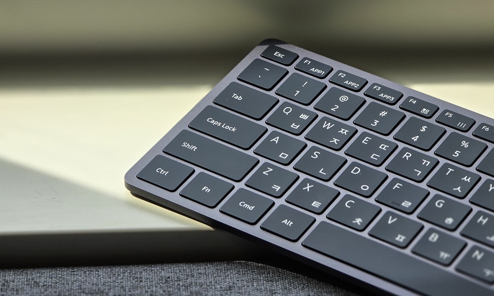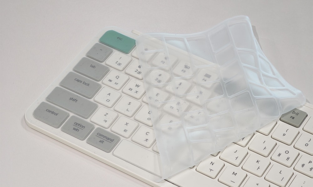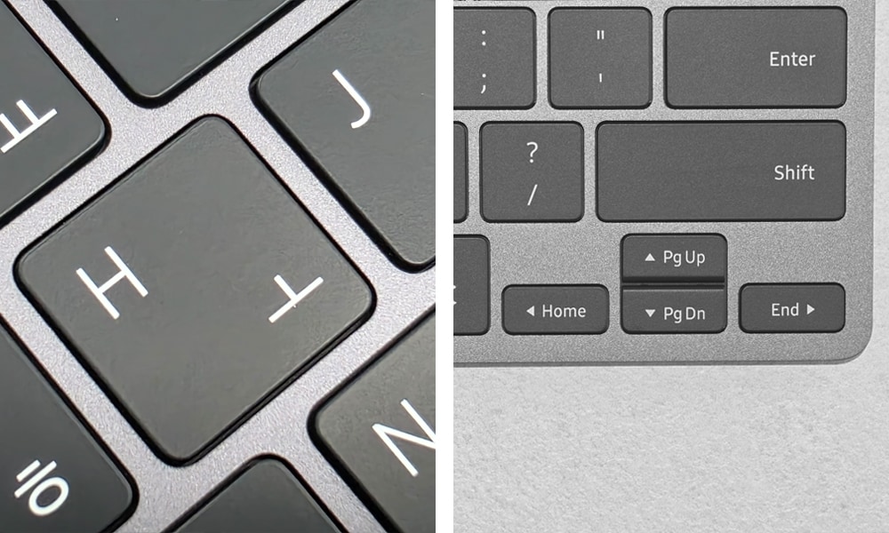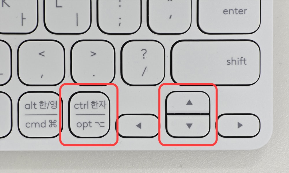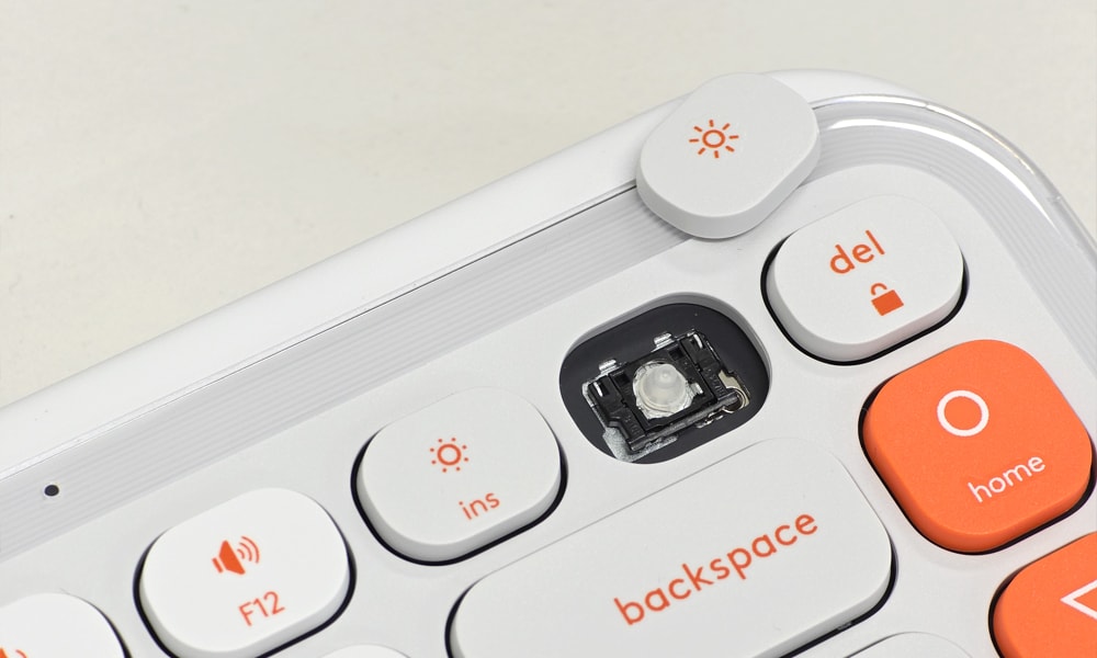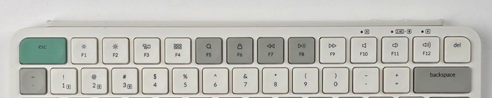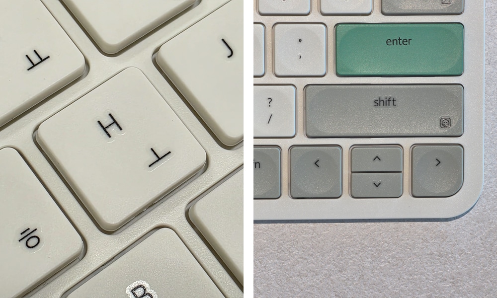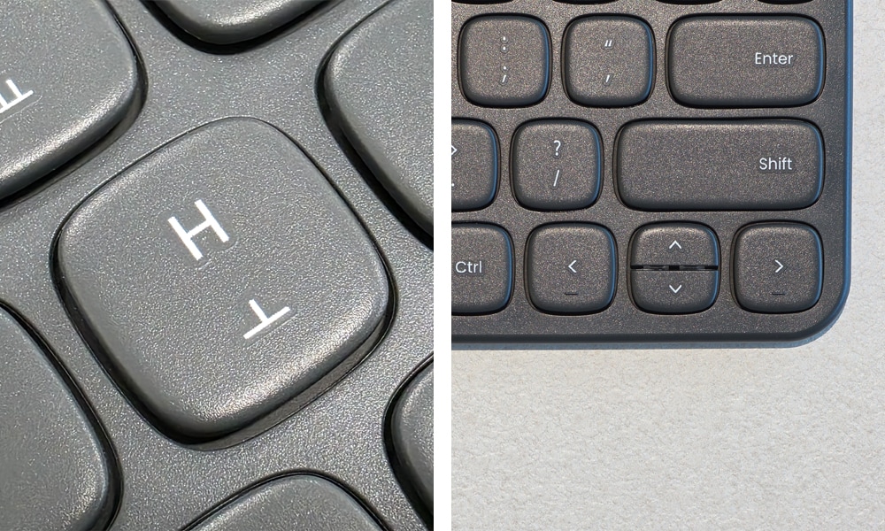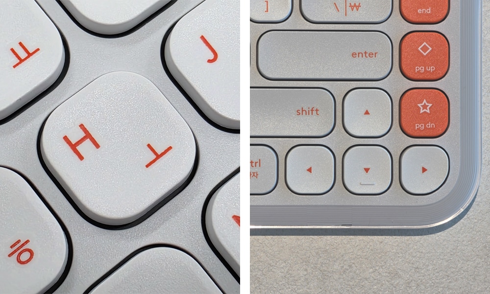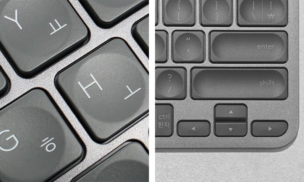 로지텍의 MX Keys Mini처럼 키캡 중앙이 오목하게 파여있는데, 오목한 깊이가 얕아 잘 느껴지지 않는 게 아쉽습니다.