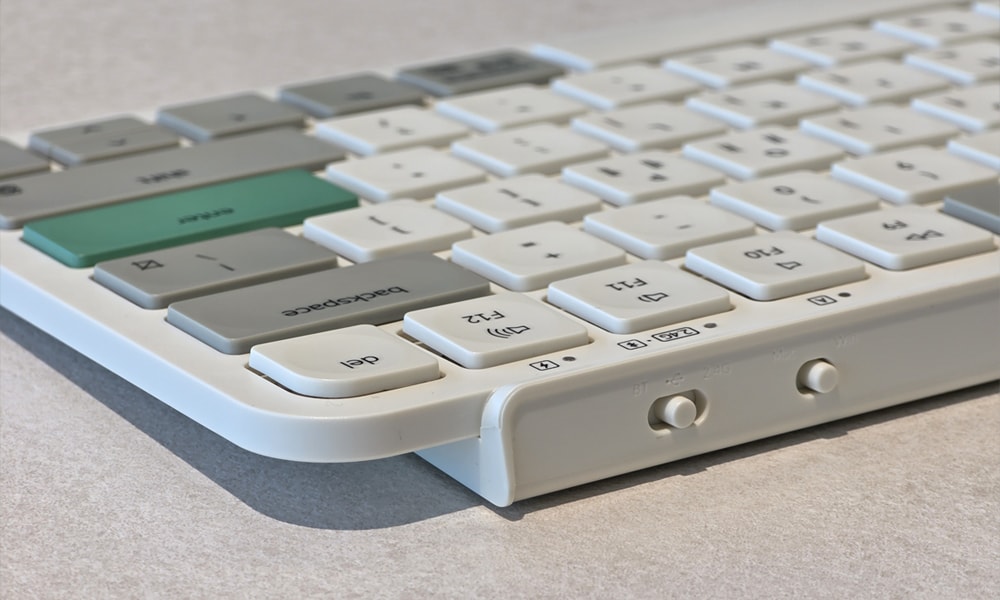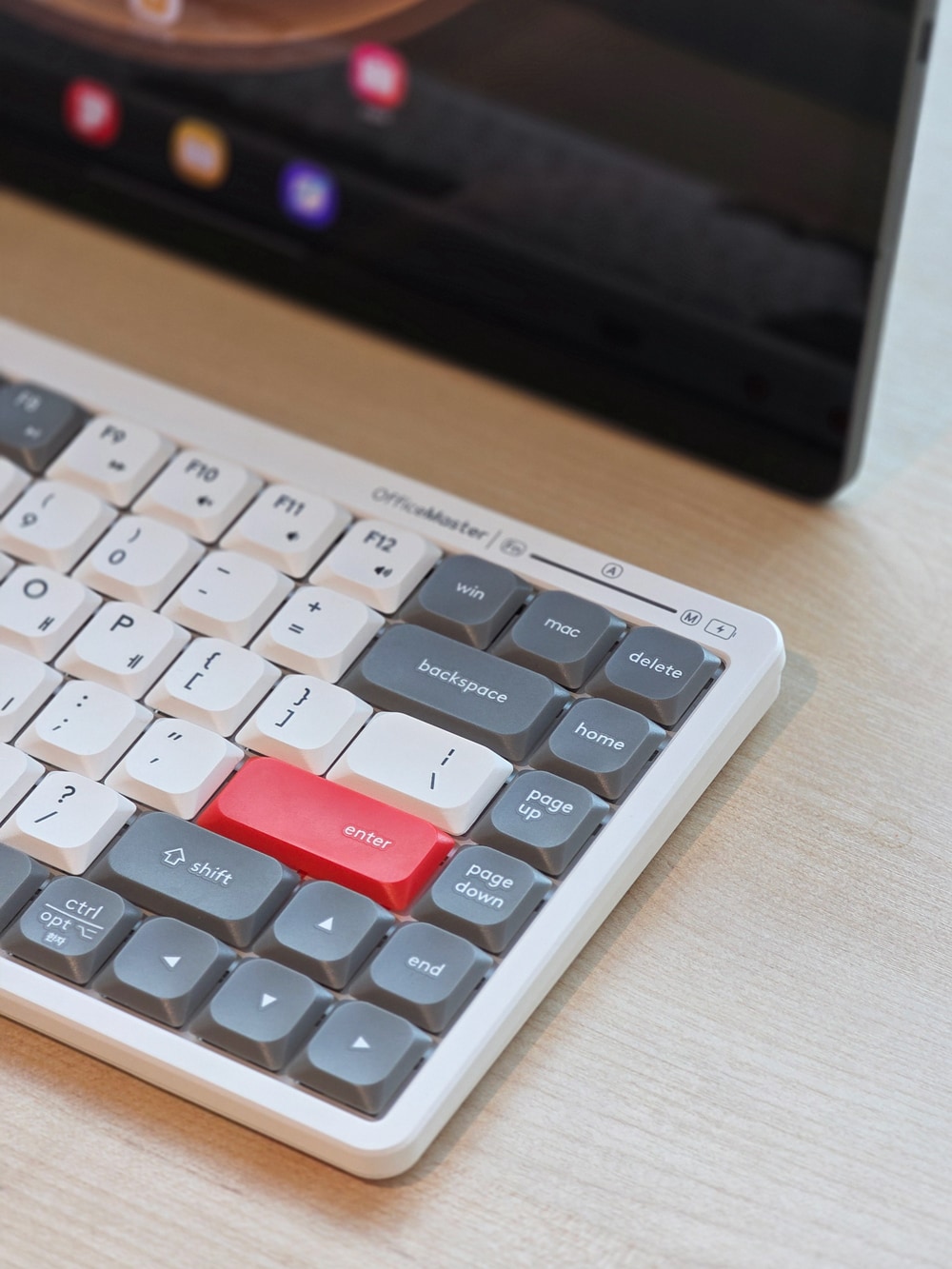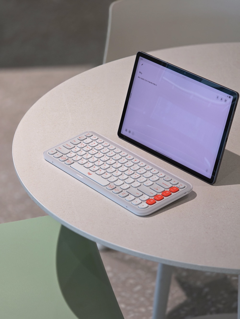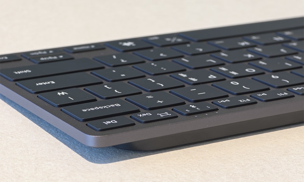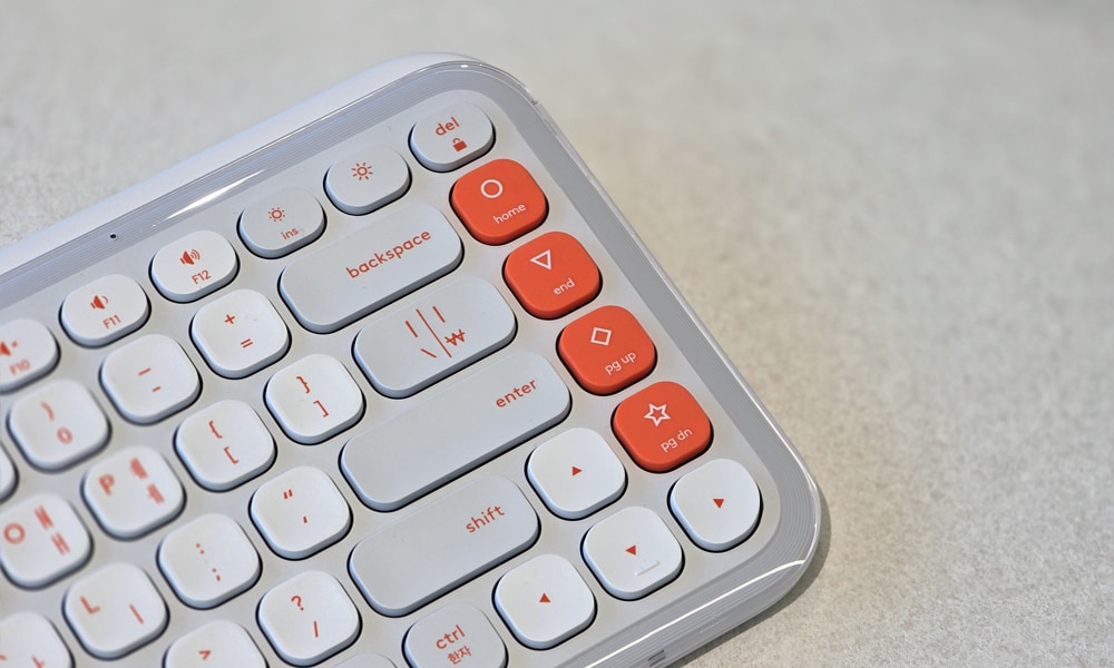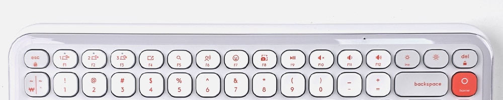 납작하고 널찍한 키캡이 여유 간격 없이 타이트하게 배열되어 있는 모습이 영락없는 로우프로파일 기계식 키보드 그 자체. 그러면서 로지텍의 POP Icon Keys와 동일하게 방향키 세로열에 기능키가 배치되어 있는 실용성도 겸비하고 있습니다.