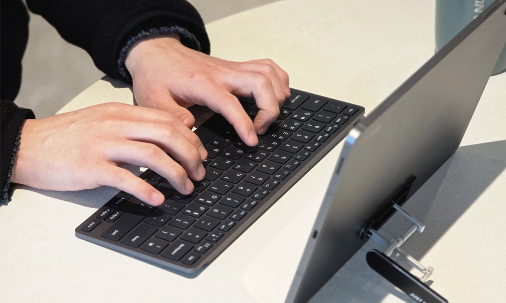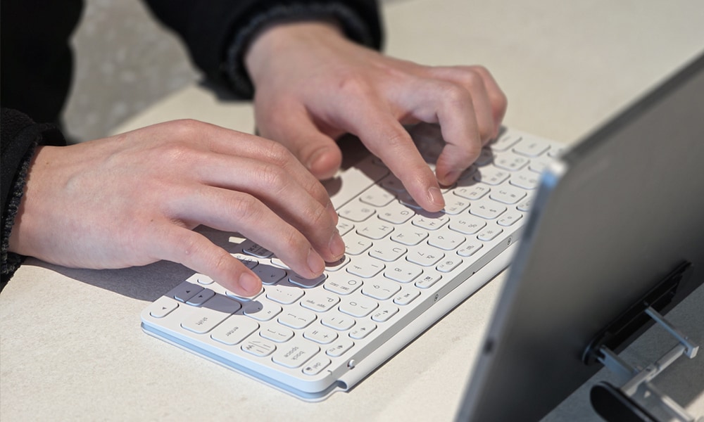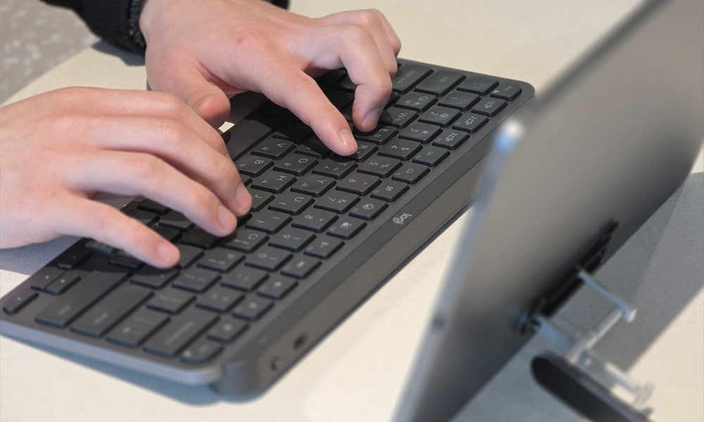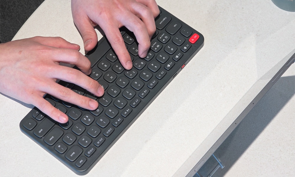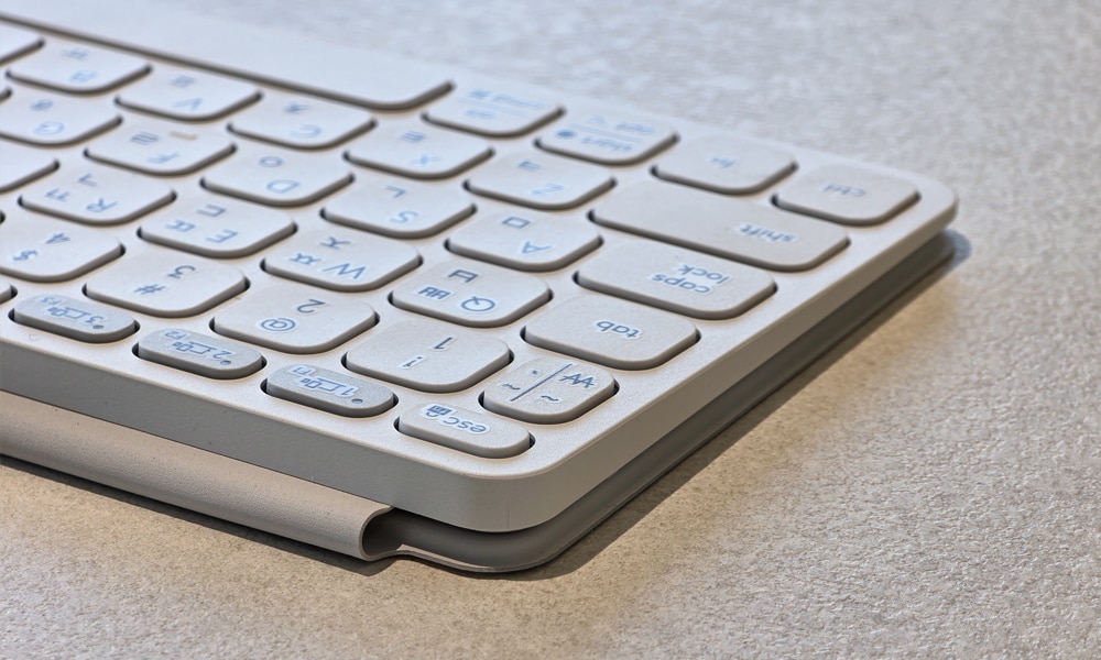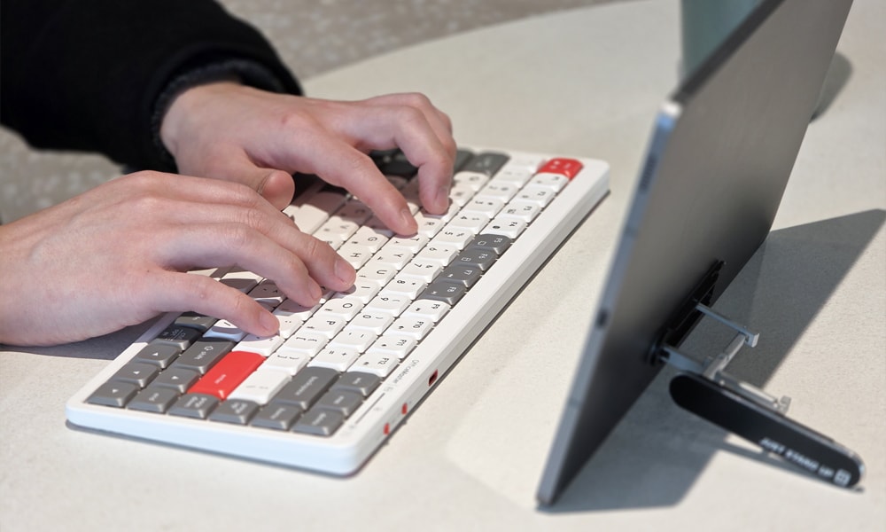 가로 278mm의 미니 사이즈 키보드로서 키캡 크기와 사이 간격이 다소 작고 좁기 때문에 로지텍의 Keys-To-Go 2를 사용할 때처럼 두 손이 안쪽으로 모이게 되고 장시간 사용할수록 오탈자 방지를 위한 긴장감에 팔이 경직되는 느낌을 받을 수 있습니다.