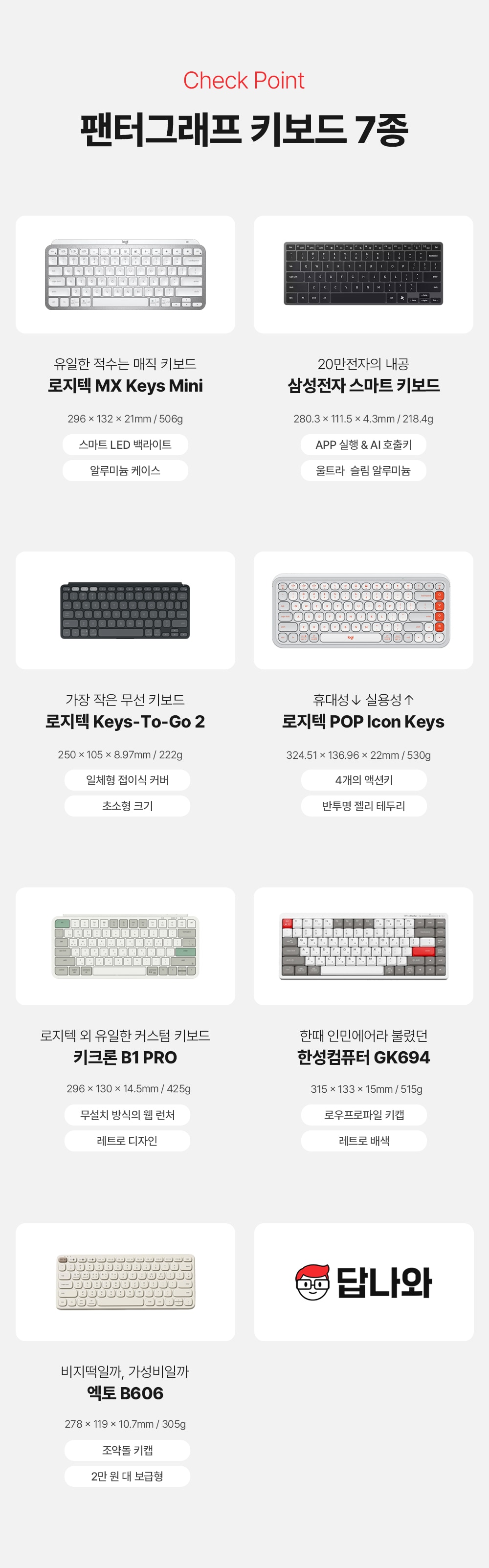 심혈을 기울여 고르고 고른 각각의 고유한 특색을 지닌 7종의 키보드는 다음과 같습니다.