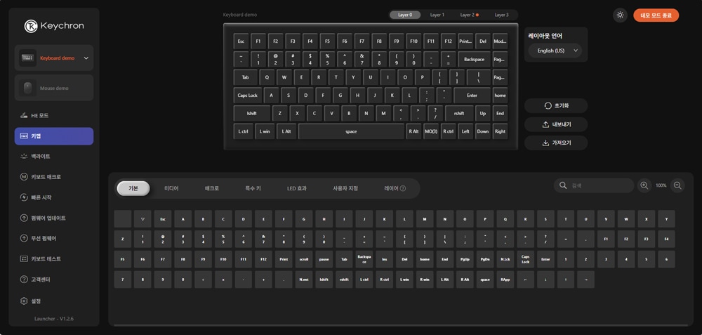 입력 커스텀 키보드 전문으로 유명한 키크론의 키보드인 만큼이나 B1 PRO 또한 무설치 방식의 웹 런처를 이용해 사용 환경을 매우 다양하고 자유롭게 커스텀할 수 있습니다.