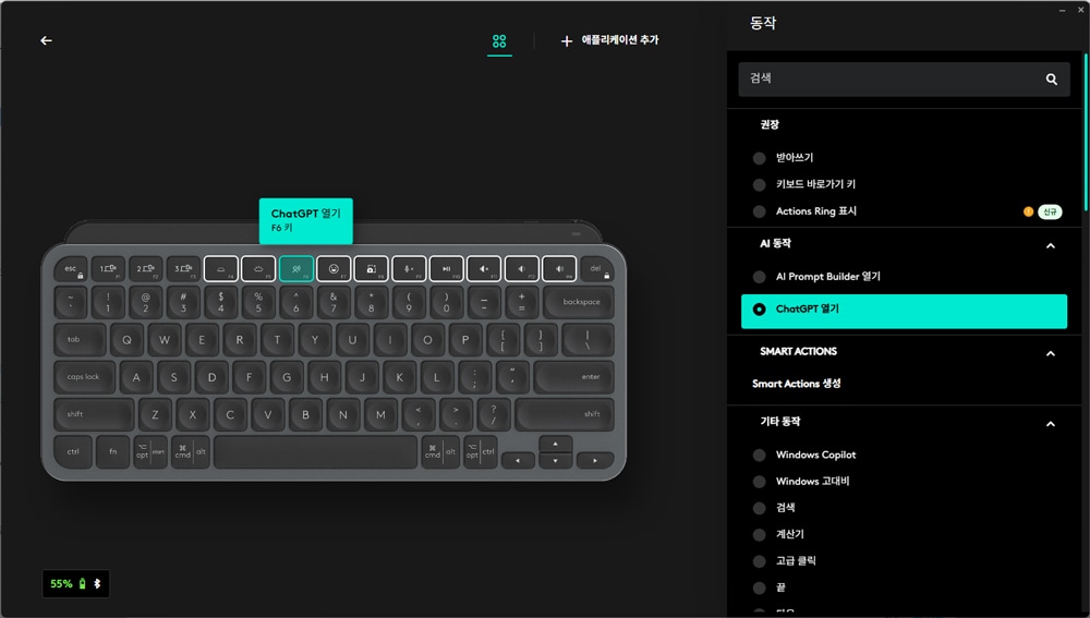 PC 환경에서 사용 시에는 Logi Options+ 소프트웨어를 이용해 상단 기능키와 4개의 액션키 각각에 대한 기능을 커스텀할 수 있습니다.