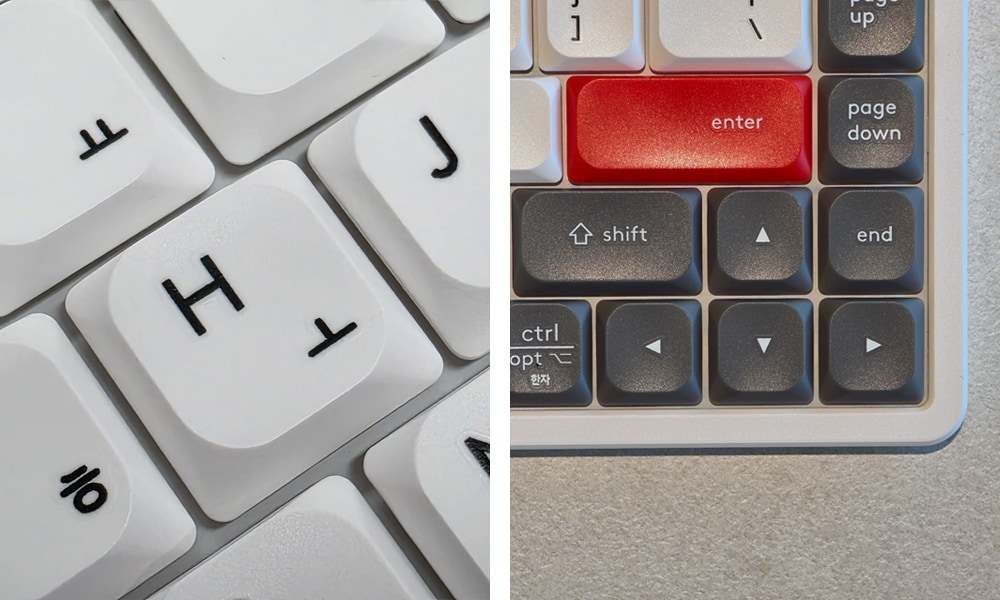 키캡 중앙이 손가락 끝 모양에 맞춰 둥글고 오목하게 파여 있습니다. 타건 시 손가락이 키의 중앙으로 자연스럽게 유도되어 오타율을 줄여주며 손끝에 닿는 경험이 매우 안정적인데, 7종의 키보드 중 가히 압도적이라 할 수 있습니다.