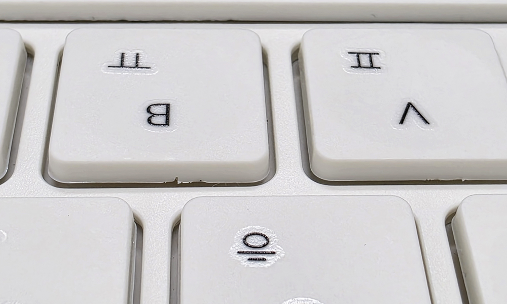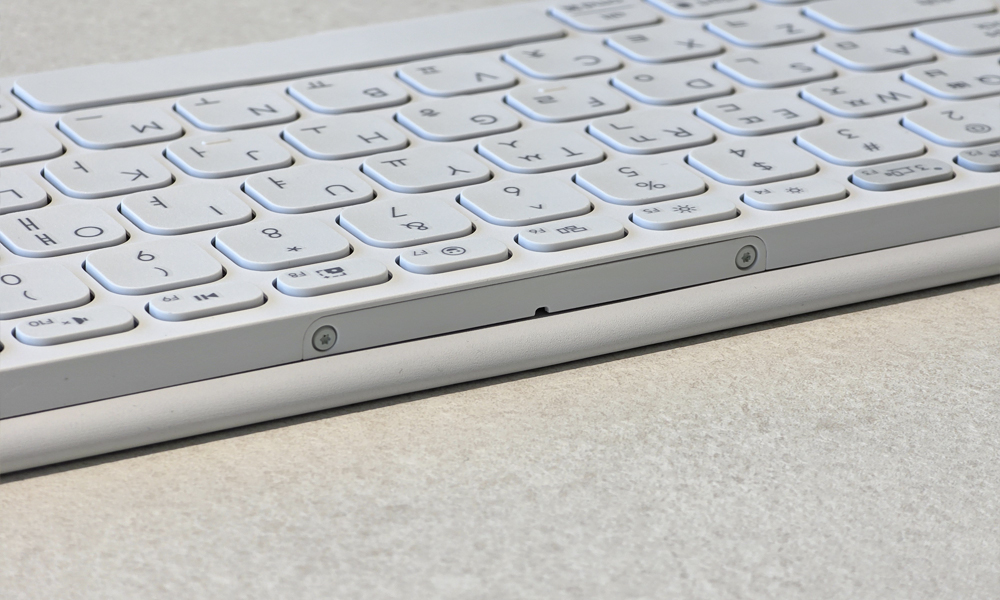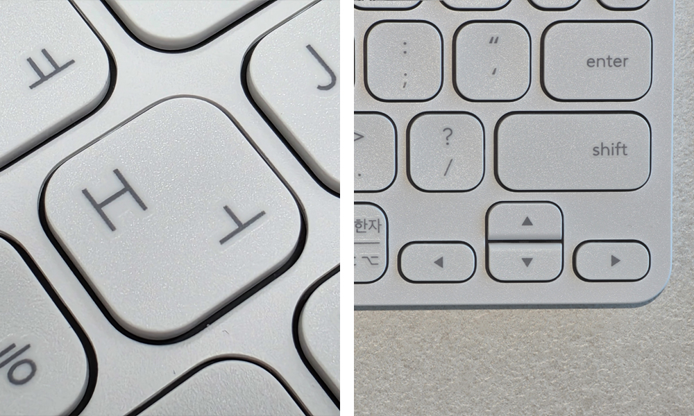 로지텍의 MX Keys Mini처럼 키캡 중앙이 오목하게 파여있는데, 오목한 깊이가 얕아 잘 느껴지지 않는 게 아쉽습니다.
