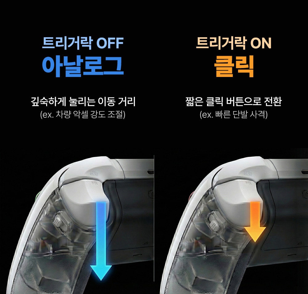 트리거 버튼을 깊숙하게 눌리는 아날로그와 짧게 클릭되는 두 가지 타입으로 실시간 전환하여 사용할 수 있는 트리거락 기능.