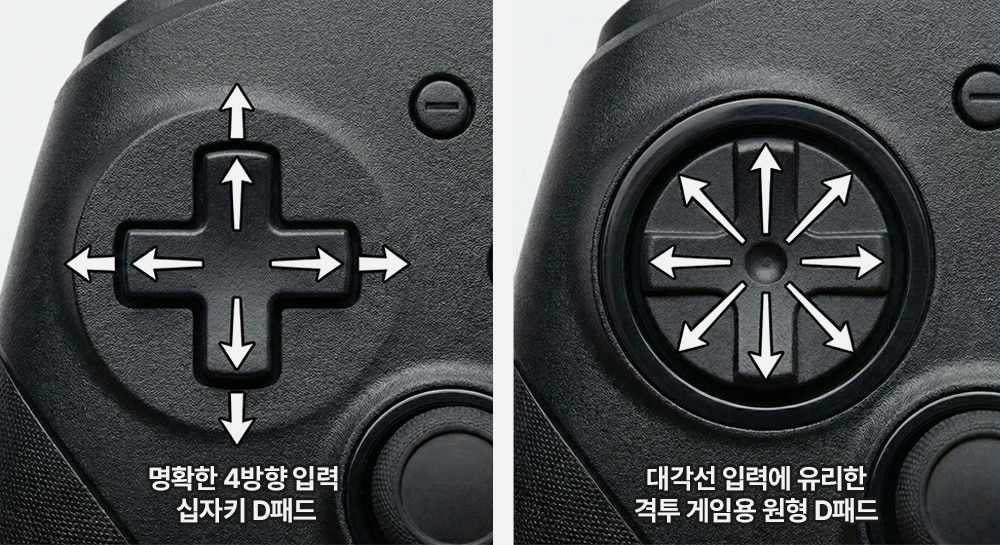 + 십자키 D패드: 오입력 없는 보다 명확한 4방향 입력. O 원형 D패드: 격투 게임에 최적화된 대각선 방향 입력 가능.
