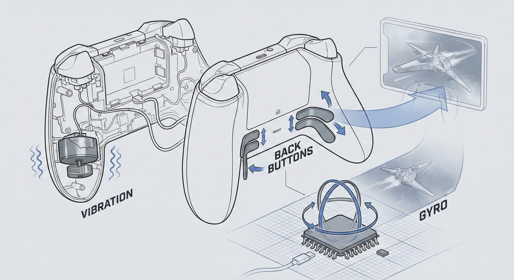 그 밖에 하드웨어 편의 기능으로는 진동과 백버튼, 자이로 센서 지원 유무로 구분할 수 있습니다. 필수는 아니지만 보다 높은 몰입감과 편의를 위해 하이엔드 게임패드들이 공통으로 채용하고 있는 요소들이죠.