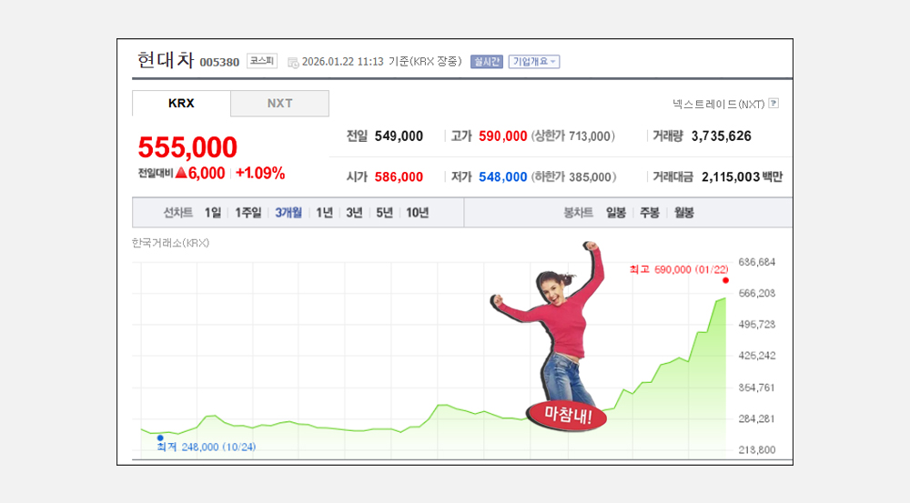 CES2026이 개막한 1월 6일 31만 8천 원이었던 현대차의 주가가 무려 55만 원을 터치.