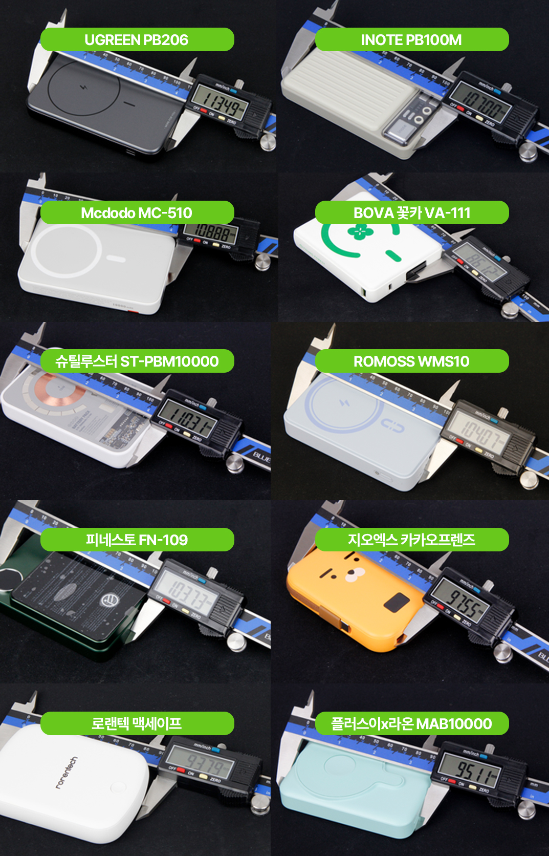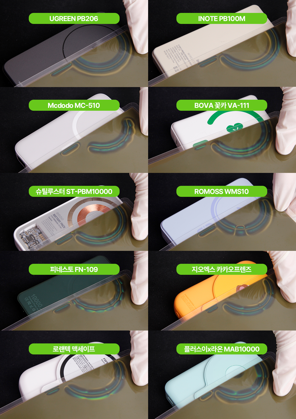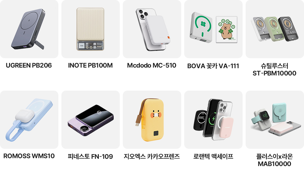 선정한 10종의 제품입니다. 모두 동일하게 10000mAh 용량이며 유무선 충전을 동시 지원하는 특징을 가졌습니다.