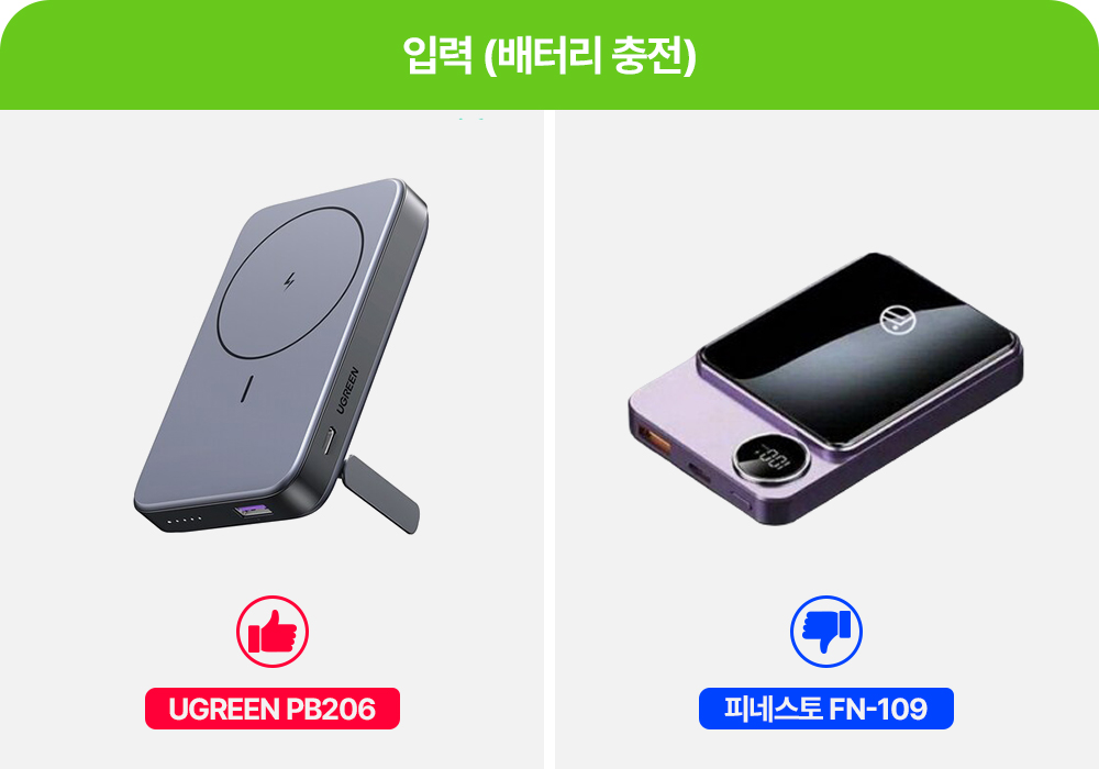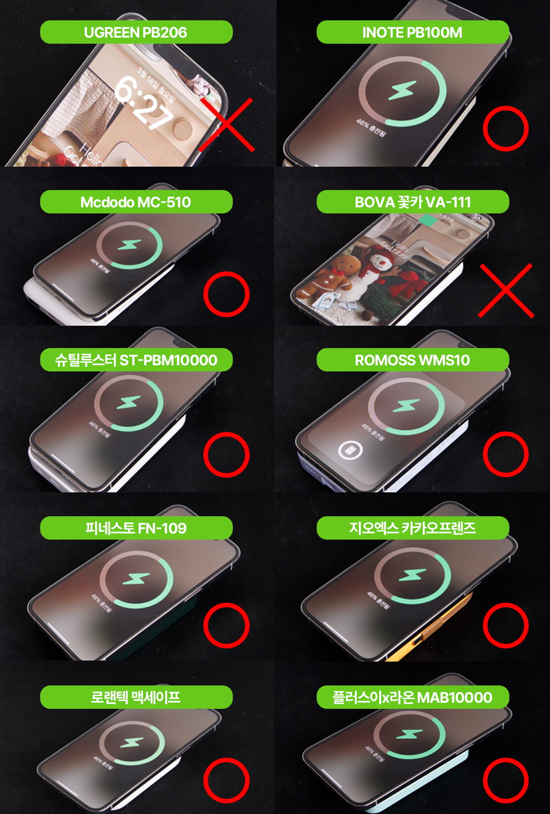 - 피네스토 맥세이프 보조배터리는 유일하게 충전 중 무선 출력을 지원하지 않아 테스트에 실패