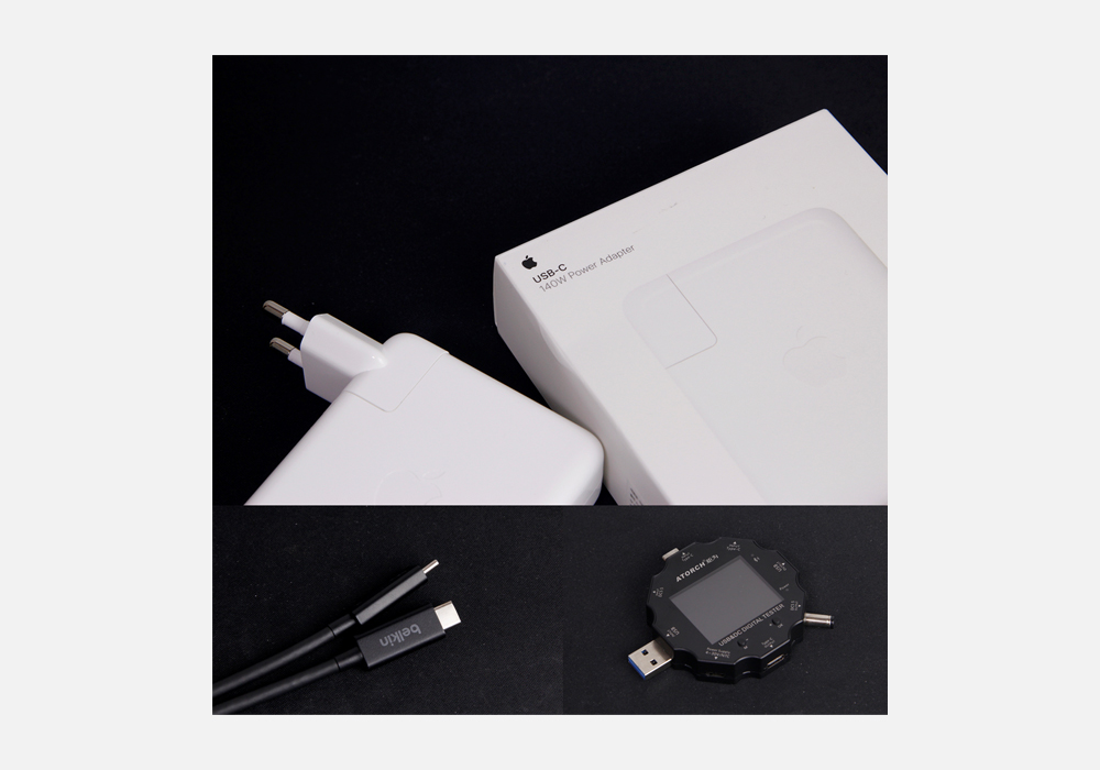 ▲ 애플 140W USB-C 초고속충전기 / ▲ 벨킨 USB C to C 케이블(2m) / ▲ ATORCH 테스터기