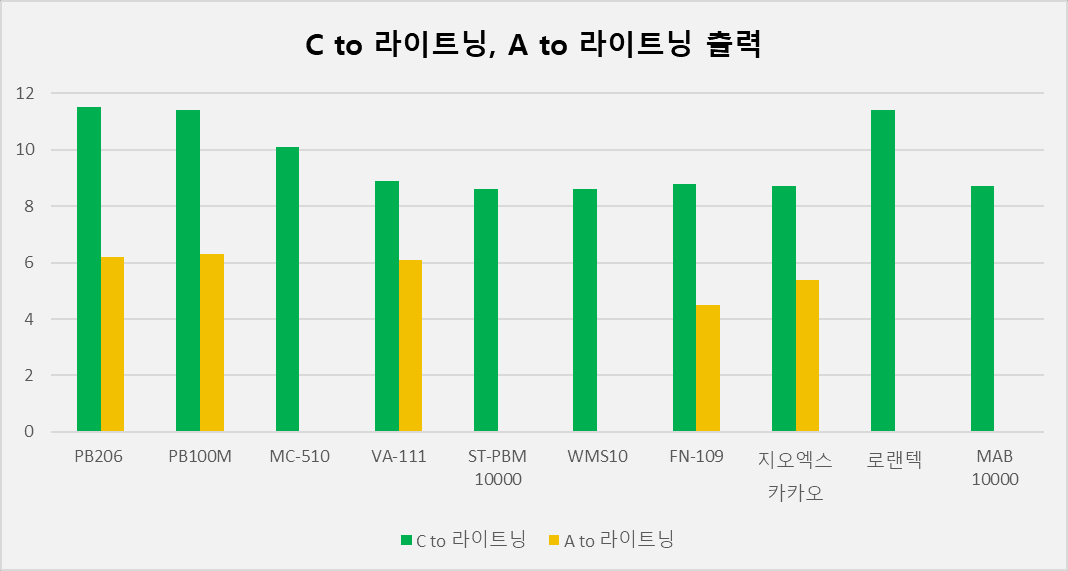 (지오엑스 카카오와 로랜텍은 15W에 약간 못 미치는 13.9W, 14W를 기록)