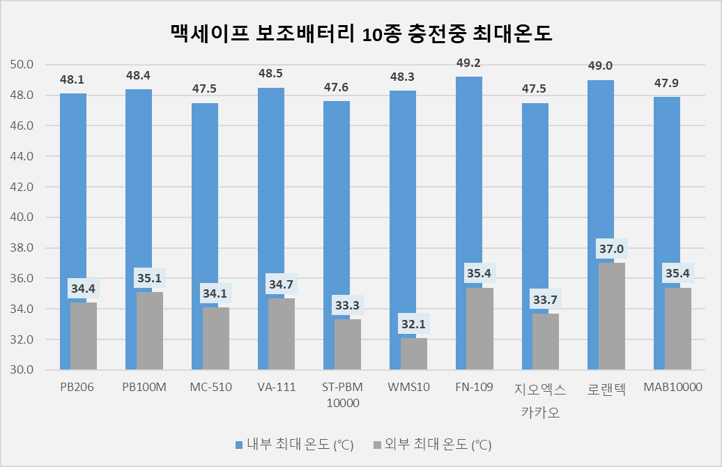 맥세이프 보조배터리 10종에 대한 온도 테스트 결과, 부착면의 최대 온도 평균은 48.2℃였는데, 이는 저온 화상의 위험이 있는 수준의 제법 높은 온도였습니다. 바지 주머니에 넣은 상태에서 충전할 시 각별한 주의가 필요하며 맥세이프 충전 상태로 전화 통화를 길게 하는 것 역시 지양하는 것이 좋습니다.