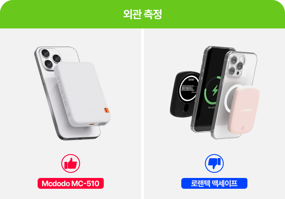 - 반면 가장 낮은 점수를 기록한 건 로랜텍 보조배터리였는데, 비교적 낮은 충전 효율과 함께 크기 및 무게가 공식 표기에서 가장 크게 벗어난 이유가 커 단죄를 내리게 되었습니다.