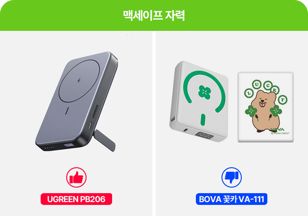 - 1위는 MFM 인증은 없지만, 널찍한 마그네틱을 기반으로 높은 자력을 보여준 UGREEN PB206