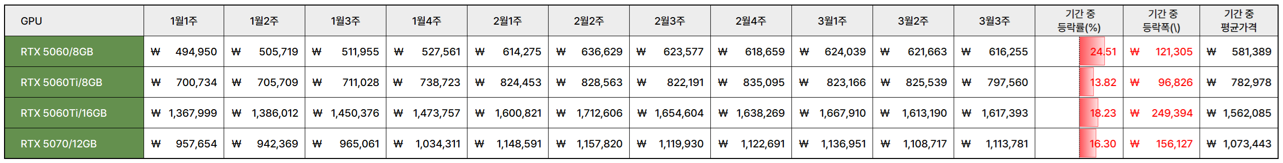 세부내역을 보면 RTX 5060(+24.51%), RTX 5060Ti/8GB(+13.82%), RTX 5060Ti/16GB(+18.23%), RTX 5070(+16.3%) 등으로