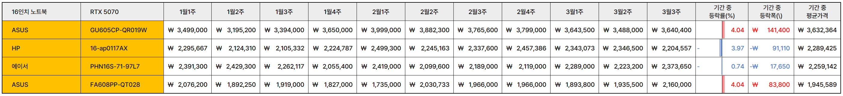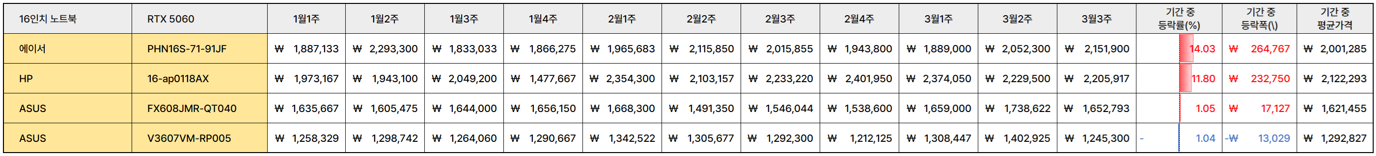 16인치 RTX 5060 칩셋 탑재 노트북의 가격 흐름은 RTX 5070과 다른 경향을 보입니다. 에이서 PHN16S-71-91JF(+14.03%), HP 16-ap0118AX(+11.8%), ASUS FX608JMR-QT040(+1.05%), ASUS V3607VM-RP005(-1.04%) 의 가격 변화를 확인할 수 있었는데요.