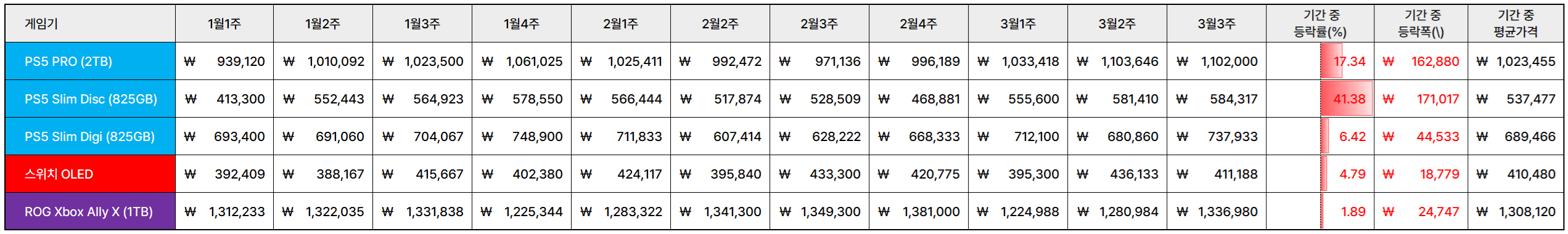 플레이스테이션5 '프로'(+17.34%), '슬림-디스크버전'(+13.82%) 가격이 15만원 이상 꽤 큰 폭으로 올랐습니다. 용량이 2TB인 '프로'의 가격이 오른 것은 이해가 됩니다만 '슬림-디스크버전'의 가격이 왜 올랐는지는 이해가 잘 안 됩니다. '슬림-디지털버전'(+6.42%) 은 상대적으로 선방했습니다. (번외로 기기 스펙이 상대적으로 낮은 스위치OLED(+4.79%) 는 가격이 많이 안 올랐습니다.)